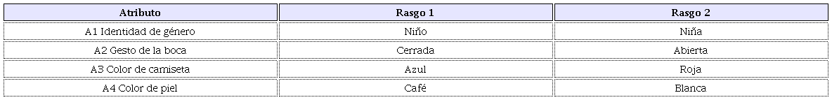 A partir del análisis cualitativo de la tarea (Pascual-Leone y Johnson, 2004), es posible establecer que el uso de la clasificación estructura las demandas cognitivas del problema y exige la intersección de cuatro clases que se definen por los atributos de los rostros dispuestos en el tablero: identidad de género (niño o niña), color de camiseta (azul o rojo), gesto de la boca (abierta o cerrada) y color de la piel (café o blanca). La intersección de las cuatro clases origina 16 subclases, entre las cuales el niño debe reconocer el rostro con los rasgos específicos seleccionados por el investigador (Tabla 2).