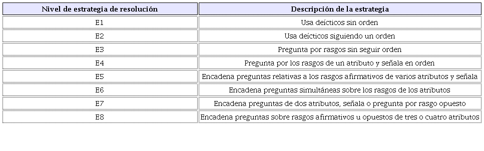 Con respecto a la octava estrategia, solo los niños de cinco años (4 %) la emplean como la más elaborada para descubrir la carita y ponen en funcionamiento el planteamiento de diferencias entre los rasgos de un mismo atributo: género (niño o niña); semejanzas entre los elementos de una clase: si el entrevistador acepta que la carita escogida es la de una niña, entonces los niños deben continuar manejando la clase caritas de niñas; distinguen relaciones de pertenencia inclusiva: la carita que busca pertenece a la clase de las caritas de niñas; establecen la intersección de una clase con otra clase: intersecan la clase de las caritas de niñas con la clase de las que tienen camisa roja, esto les exige crear una nueva clase con el color de la camisa; también, definen intersecciones sucesivas entre más de dos clases en una operación multiplicativa compleja: la clase de las caritas de niñas y la clase de las que tienen la camisa roja se intersecan con las que sonríen y las que tienen piel blanca; por último, inclusión entre clases: la clase de las que tienen camisa roja y las que sonríen están incluidas en la clase de las niñas. Así, emerge un sistema de clases con base en vínculos de complementariedad. A pesar de que se reconoce que con el aumento de la edad existe un porcentaje de niños que usan la octava estrategia, se recalca que la variabilidad en todos los rangos de edad es el dato que resulta prometedor para la psicología del desarrollo.
