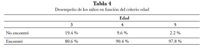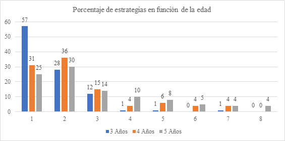 La presentación de los resultados incluye el estudio del desempeño de los niños y las estrategias que emplean en la resolución de la tarea. Así, la Tabla 4 expone los desempeños y la Figura 1 evidencia las estrategias de los niños en cada grupo de edad. El análisis de las estrategias muestra que los porcentajes de resolución distan en función de la edad. Un Anova de dos vías de clasificación permitió encontrar diferencias significativas en el porcentaje de los niños y el uso diferenciado de ocho tipos de estrategias. De este modo, en los tres grupos de edad, el nivel de desempeño en la resolución del problema fue significativamente alto: 80.6 % para los niños de tres años, 90.4 % para los de cuatro años y 97.8 % para los de cinco años. En consecuencia, los datos constatan un aumento progresivo con la edad en el desempeño de los niños al resolver la tarea (Tabla 4).