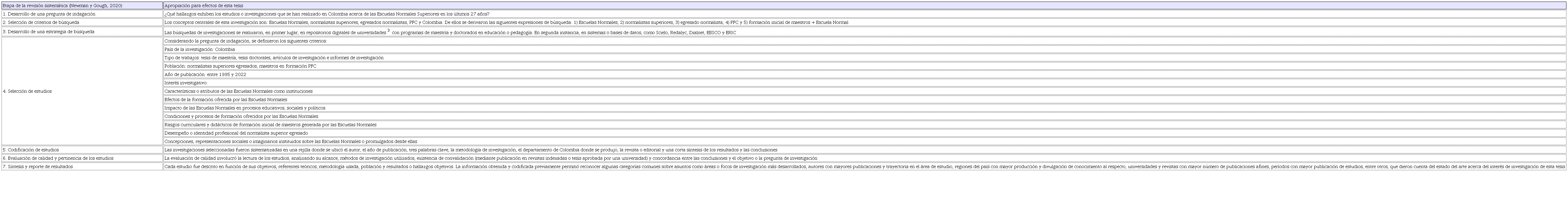A nivel metodológico, se ha apropiado el método de revisión sistemática propuesto por Newman y Gough (2020) para investigaciones educativas, el cual involucra siete etapas. En la Tabla 1 se presenta esta ruta y la manera como fue adaptada en el marco de la presente investigación.