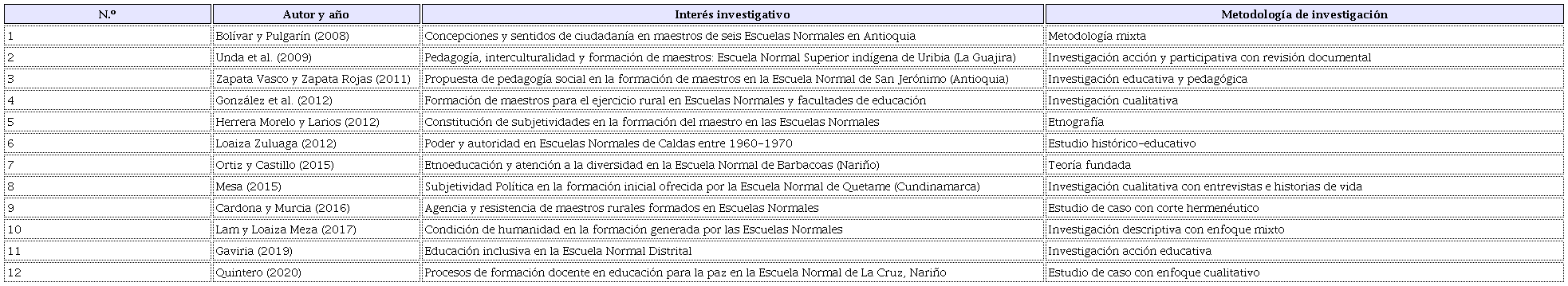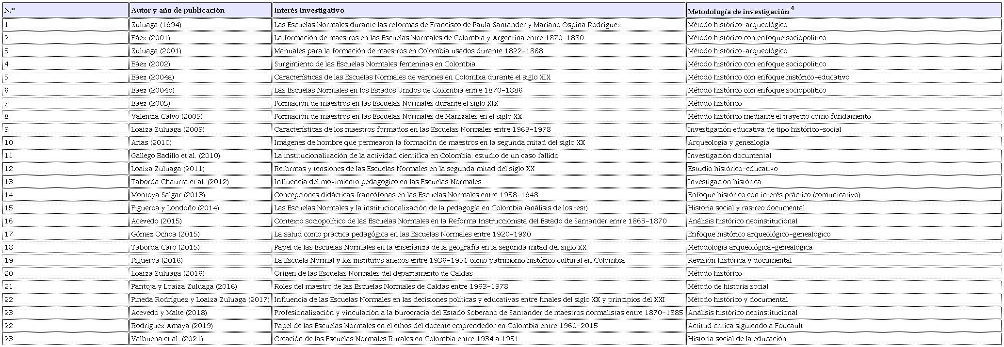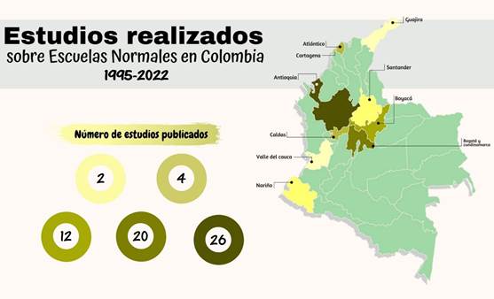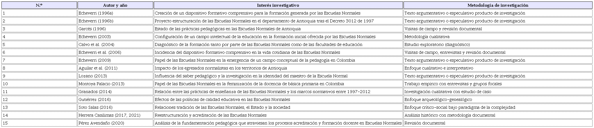 De acuerdo con los resultados de la revisión sistemática, puede notarse que la investigación acerca de las Escuelas Normales en Colombia durante las últimas dos décadas y media presupone un terreno bastante abonado con producciones de distinto origen y estructuradas desde múltiples métodos y enfoques investigativos. En este caso, fueron rastreados 83 trabajos, dando cuenta de un campo plural que ha llamado la atención de la comunidad académica colombiana y que lo seguirá haciendo, toda vez estas instituciones han sido protagónicas en la educación del país, así como en la configuración disciplinaria que de la pedagogía se ha hecho.