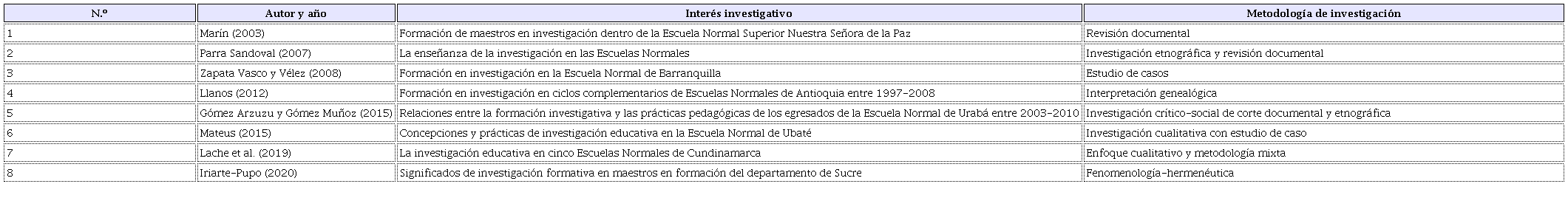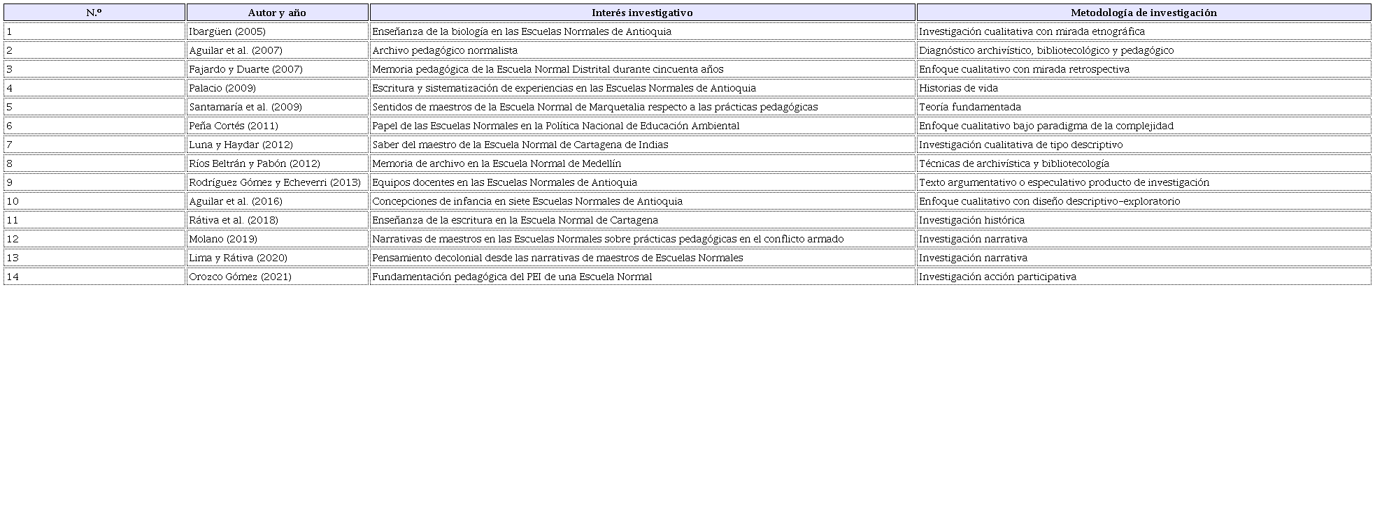 Entendiéndose que, a partir de esta perspectiva de la formación, en este núcleo se inscriben las investigaciones que han tratado de construir una radiografía de las actividades propias de las Escuelas Normales en el plano de la formación docente, abordando sus sentidos e implicaciones. Sentidos que, en el trabajo gadameriano, actúan como estatutos o soportes para fijar el horizonte interpretativo acerca de la manera en que, dentro de dicha formación, las personas trabajan en sí mismas. En ese orden de ideas, son aglutinados en este núcleo quince trabajos investigativos que dan cuenta de la naturaleza formativa de las Escuelas Normales y los sentidos derivados de esta posibilidad, los cuales hacen traducible e interpretable sus comprensiones y modos de ser-estar en el mundo. De esta forma, como se aprecia en la Tabla 3, estos estudios presentan distintos diseños metodológicos -cercanos en su mayoría al enfoque cualitativo- y en general, buscan describir las características de una Escuela Normal en el contexto colombiano.
