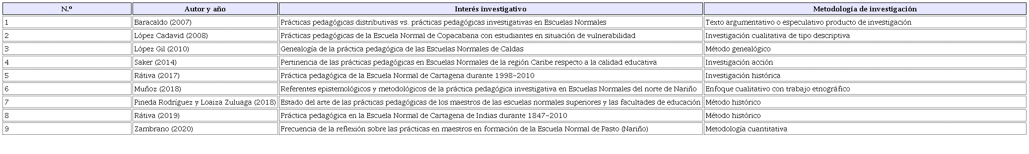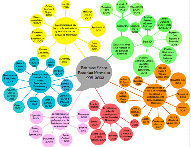 Con base en estos estudios, es lícito ingresar a territorios entramados por saberes y prácticas que han establecido las Escuelas Normales en sus trayectos de formación inicial. En estos se explicitan distintas formas de producción y circulación del saber pedagógico, así como los objetos que atraen la atención de los maestros para producirlo, ya fuera desde la reflexión sobre la enseñanza y las didácticas específicas de las áreas, esforzándose por mejorar prácticas de enseñanza (Ibargüen, 2005; Luna y Haydar, 2012; Palacio, 2009; Peña Cortés, 2011; Rátiva et al., 2018), el desarrollo de saberes pedagógicos desde el trabajo sinérgico de equipos de maestros (Orozco Gómez, 2021; Rodríguez Gómez y Echeverri, 2013) y la preocupación por la infancia (Aguilar et al., 2016), o ya fuera desde asuntos más recientes, por ejemplo, la consolidación de las narrativas como forma de construcción del saber (Lima y Rátiva, 2020; Molano, 2019).