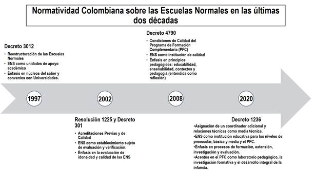 El nombre y la independencia de las Escuelas Normales fue recobrada hacia 1997 con el Decreto 3012. A partir de este momento, la normatividad no solo reguló los procesos de formación docente al interior de estas reestructuradas instituciones, sino que también las conceptualizó, haciendo inteligible el modo en que se engranarían en el aparato educativo estatal y circunscribiendo sus acciones y dinámicas a estas concepciones estatales que pueden verse en la Figura 1. De esta manera, con el Decreto 3012 de 1997 las Escuelas Normales fueron asumidas como unidades de apoyo académico para la formación de maestros, siendo necesario para su funcionamiento el establecimiento de un convenio con una institución universitaria que, entre otras cosas, supervisara y realimentara sus procedimientos institucionales. Más tarde, con la Resolución 1225 de 2002 y el Decreto 301 de 2002, se definieron la acreditación previa y la acreditación de calidad como mecanismos para que las Escuelas Normales siguieran funcionando, siempre que cumplieran con los requisitos considerados como garantes de calidad educativa.