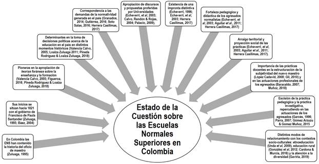 En conclusión, las Escuelas Normales pueden conceptuarse como institutos que históricamente se han dedicado a la formación inicial de maestros en Colombia, correspondiendo a prácticas discursivas,5 ideales de formación y fuerzas de dominación ejercidas sobre ellas desde distintos dispositivos de poder: el Estado, las universidades y, en los siglos previos, la Iglesia. A partir de ello, las Escuelas Normales han prefigurado un statu quo sobre el maestro, la pedagogía, la enseñanza y otros términos articuladores del campo profesional y disciplinar de la pedagogía, los cuales tienen implicaciones pedagógicas, antropológicas, políticas y éticas sobre sus modus operandi al interior de la formación docente. En la Figura 5 se sintetizan algunos elementos del estado de la cuestión hasta aquí esbozado.