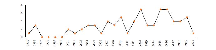 En cuanto al comportamiento de la producción investigativa, como se exhibe en la Figura 4, puede notarse que los años anteriores e inmediatamente posteriores a la emisión de la normatividad sobre las Escuelas Normales se evidencian ligeros incrementos en la publicación de estudios. Por ejemplo, los años previos y siguientes a la emisión del Decreto 4790 de 2008. Aunque este fenómeno supone un asunto a examinar, de modo que se puedan correlacionar las intencionalidades investigativas y las condiciones de producción normativa en el país.