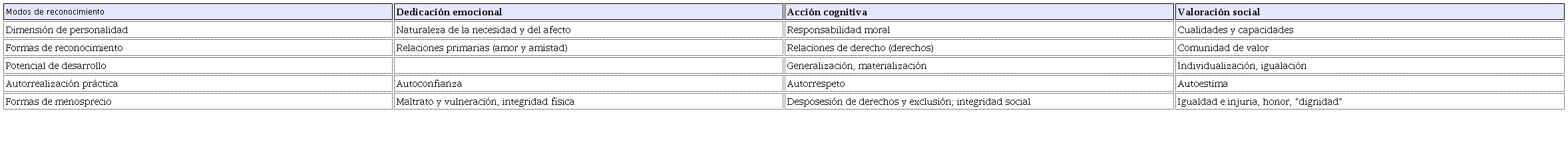 Lo planteado le permite a Honneth sostener que tanto las formas de menosprecio como las esferas de reconocimiento recíproco que se asocian a ellas, para desarrollar esas autorrelaciones positivas que protegen a los sujetos de las heridas morales, están sometidas a transformaciones históricas. Las formas de indiferencia afectiva en las relaciones personales y familiares, la negación de los derechos y la desvaloración social son dimensiones que dependen históricamente, ya sea de la concepción de amor y familia, del nivel de universalización de los derechos o del horizonte axiológico común. En virtud de ello, el autor propone una tipología de niveles de reconocimiento, dimensiones de los sujetos en relación con las esferas sociales de reconocimiento y formas de vulneración o menosprecio (Tabla 1).