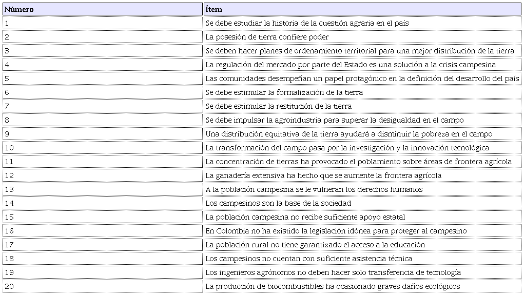 Se utilizó la escala psicométrica tipo Likert para la medición y el posterior análisis de las percepciones de los estudiantes de la Escuela de Ingeniería Agronómica de la Universidad Pedagógica y Tecnológica de Colombia (UPTC) frente a la RRI. En la construcción de la escala se recogieron cien ítems en seis categorías: (1) acceso y uso de la tierra, (2) programas de desarrollo con enfoque territorial, (3) infraestructura y adecuación de tierra, (4) desarrollo social, (5) estímulo a la producción agropecuaria y a la economía solidaria y cooperativa, y (6) sistema de seguridad alimentaria.