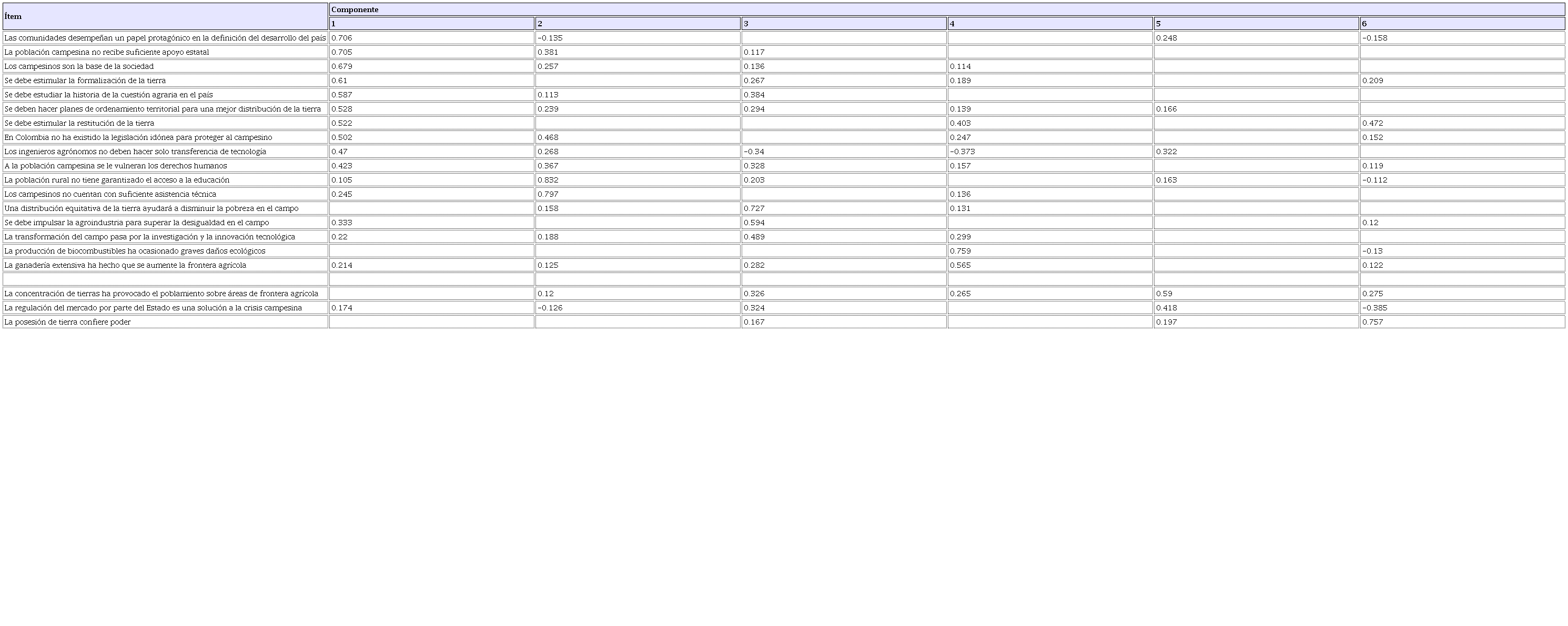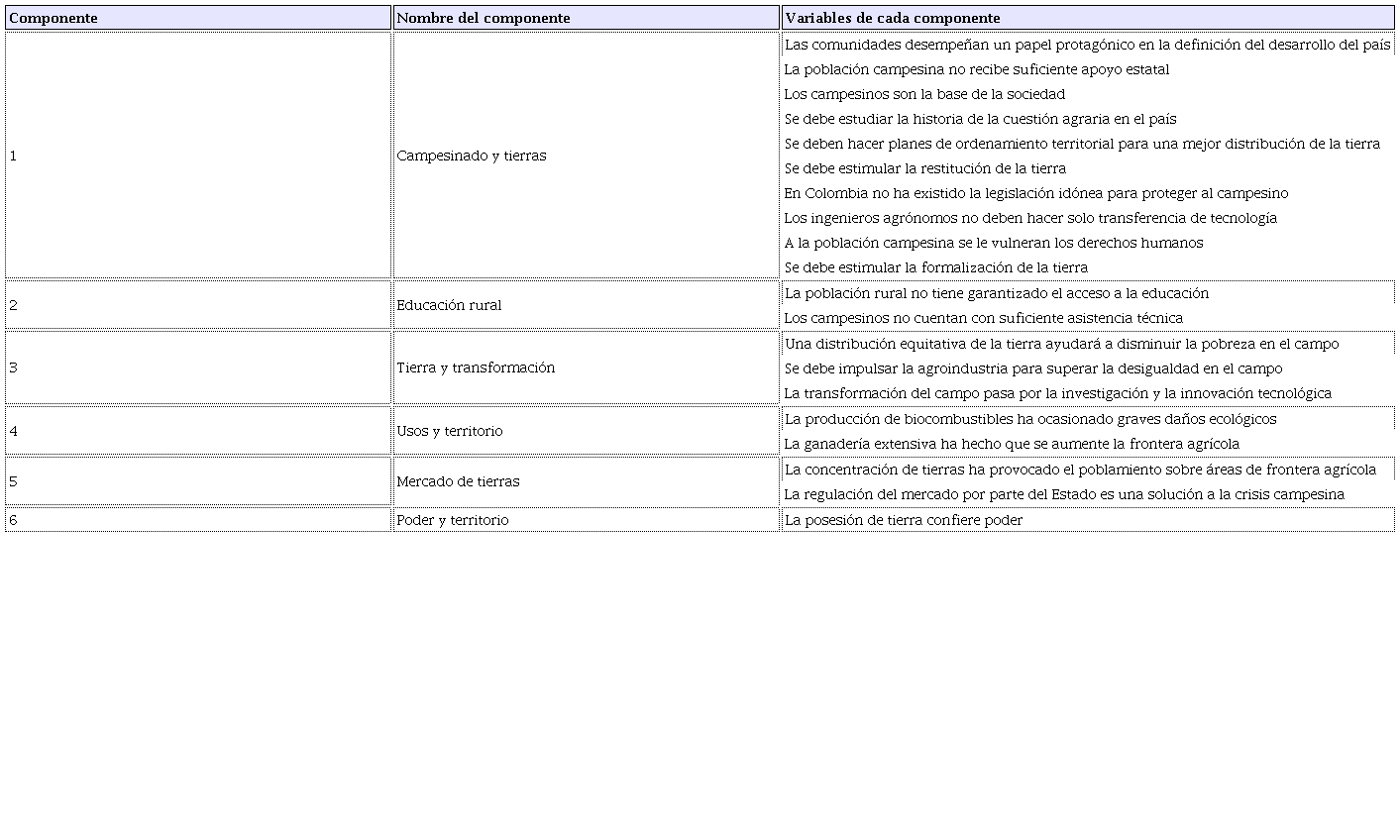 Un análisis global permite indicar que a pesar de que los componentes resultantes del análisis factorial son entes autónomos, con características particulares en función de su carga teórica, evidenciada en las similitudes de las variables que agrupa, se relacionan entre sí al considerar de manera transversal los conceptos tierra y su distribución, y campesinado.