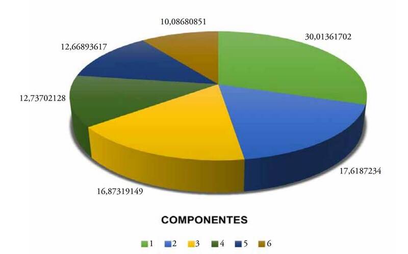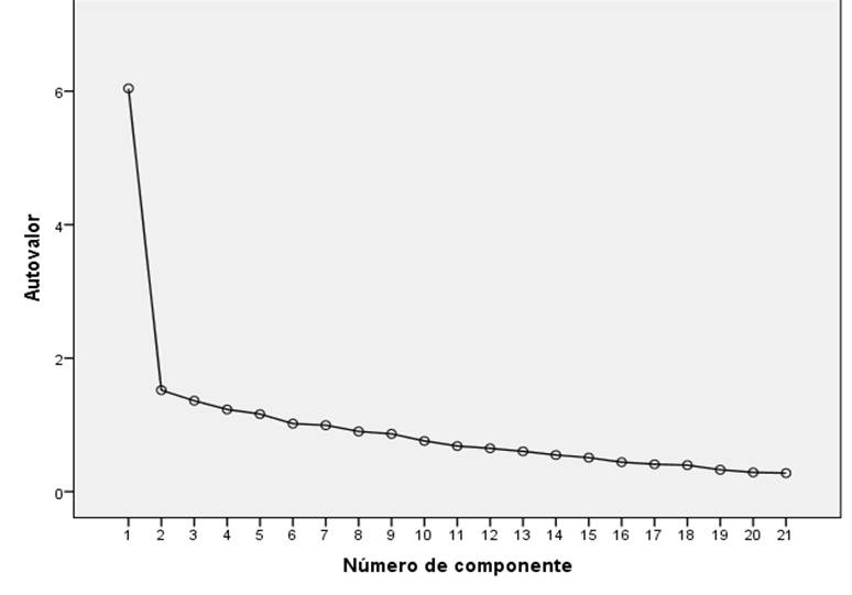 El valor de KMO de 0.845 indicó una excelente adecuación de la muestra al análisis factorial (Nica, 2020). Igualmente, la prueba de esfericidad de Bartlet con un valor de 0.000 mostró una alta significancia y señaló que la matriz es factorizable (Fernandes et al., 2020). Por su parte, la Figura 1 muestra la gráfica de sedimentación. Para ello, se escogieron los componentes cuyos valores propios (autovalores) fueran mayores que uno (valores propios > 1). Esto permitió indicar, con ayuda del algoritmo propio del análisis factorial, que se debían seleccionar seis componentes (Tabla 2).