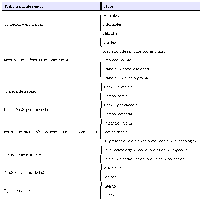 De acuerdo con Feldman (1994), Gobeski y Beehr (2009), Shultz (2003) y Wang et al. (2008), el trabajo puente tiene dos modalidades: la primera es el trabajo puente profesional, en otras palabras, aquel que se encuentra en el mismo sector o área en la que se venía trabajando, en la misma organización o en otra, o en la misma profesión u ocupación; y la segunda es el trabajo puente en un campo diferente, en una ocupación o profesión distinta (Van Solinge, 2014). Además, estas dos modalidades pueden darse a tiempo parcial o completo, permanente o temporal (Mulvaney, 2019; Zitikytė, 2019), y en forma asalariada, como trabajo autónomo (Wang et al., 2008), por cuenta propia (Mohamed, 2012) o emprendimiento (Topa et al., 2014). La complejidad actual tanto normativa como cotidiana de las relaciones de trabajo y formas de contratación hacen que este espectro pueda ser mayor (Rentería-Pérez, 2019).