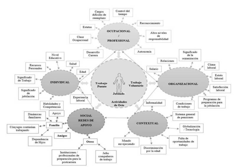Teniendo en cuenta lo mencionado hasta el momento, se presentan complementariedades a lo planteado por Kim y Feldman (2000) sobre la teoría de la continuidad en la decisión de la jubilación. Se amplía dicha propuesta incorporando no solo el factor contextual como relevante e, incluso, moderador en el proceso, sino también una cualificación de las características del trabajo puente visibilizando posibilidades en cuanto a las ocupaciones, profesiones y modalidades de trabajo. En la Figura 1, se presenta un ejemplo de Londoño-Moreno (2018) que esboza la diversidad de dimensiones y factores con límites porosos y mutuamente relacionados, los cuales inciden en la toma de decisiones en la jubilación, en este caso para pensar en elegir trabajos puentes, en el sentido que se intenta establecer los antecedentes dentro de un proceso de carácter más dinámico, complejo y poco delimitado, dicho de otro modo, menos lineal según las coexistencias de las realidades (Rentería-Pérez, 2019) y transiciones de trabajo (Alcover, 2020).