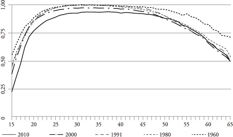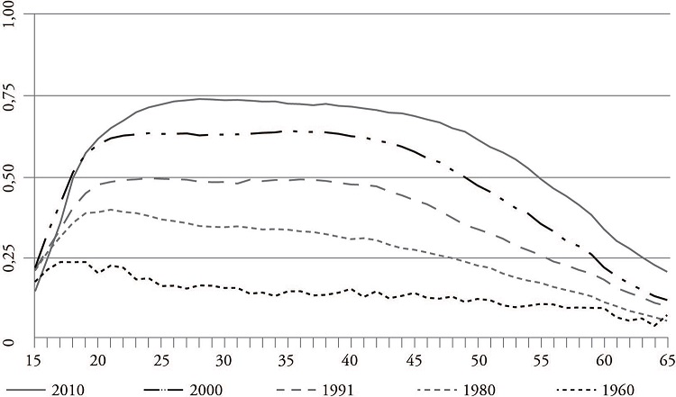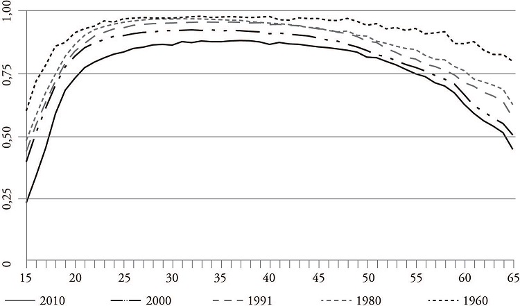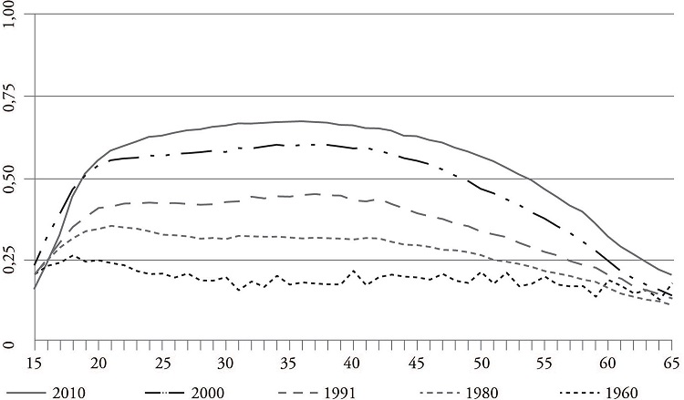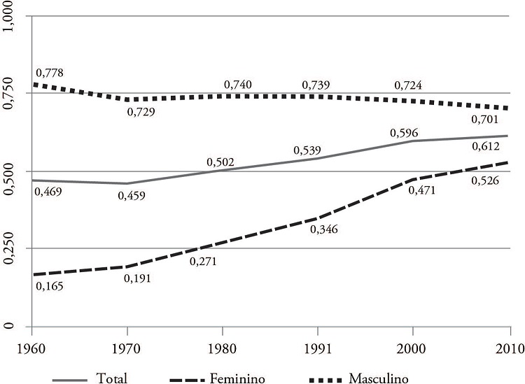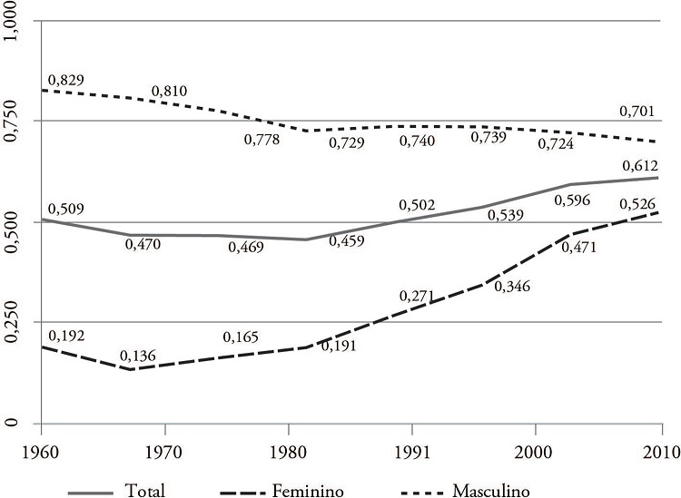 Nos últimos cinquenta anos, o mercado de trabalho consolidou-se, no Brasil, como o espaço em que os indivíduos estão premidos a buscar sua sobrevivência. Este processo implica ampliação da oferta efetiva de trabalho, isto é, peso crescente da população economicamente ativa (ocupados e desempregados) no conjunto dos indivíduos em idade ativa. A esfera do mercado de trabalho, que nos anos de 1960 retinha apenas quatro em cada dez brasileiros, passou, nos anos de 2010, a ser um espaço imperioso para produção da sobrevivência entre quase sete a cada dez brasileiros em idade ativa. Mais que isso, tal esfera, antes um domínio masculino, alterou de maneira substancial sua composição por sexo, com interfaces importantes com outros processos, como a notável redução da fecundidade e a significativa ampliação da escolaridade feminina. Os dados indicam que as propensões entre grupos de sexo não apenas eram distintas, como também variavam de modo diverso no curso do tempo. A evolução dos diferenciais por grupos de sexo mostra que as probabilidades de recurso ao mercado de trabalho entre as mulheres é muito diferente ao longo dos anos. Mesmo não atingindo os mesmos níveis de participação dos homens em 2010, é notável o crescimento nas suas chances de participação.