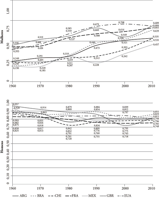 Pode-se arguir que se trata de um momento de avanço generalizado das mulheres em direção ao mercado de trabalho, o que não deixa de ser verdadeiro. Entretanto, a comparação com outros países revela que esse processo no Brasil apresentou certa singularidade. Conforme dados da OIT, para este mesmo período, na França, por exemplo, a incorporação feminina passou de 0,42 para 0,66 e nos Estados Unidos, de 0,39 para 0,68; ou seja, os patamares iniciais já eram sensivelmente mais elevados do que aquele observado no Brasil e os pontos de chegada nesse crescimento são bem mais próximos aos nossos. Mesmo na Argentina, país de industrialização tardia como a brasileira, o engajamento feminino já alcançava 0,24 em 1960, chegando a 0,53 (quase igual ao patamar do Brasil) nesses mesmos cinquenta anos.