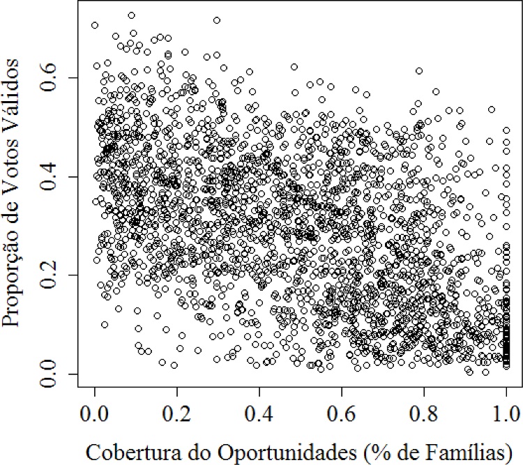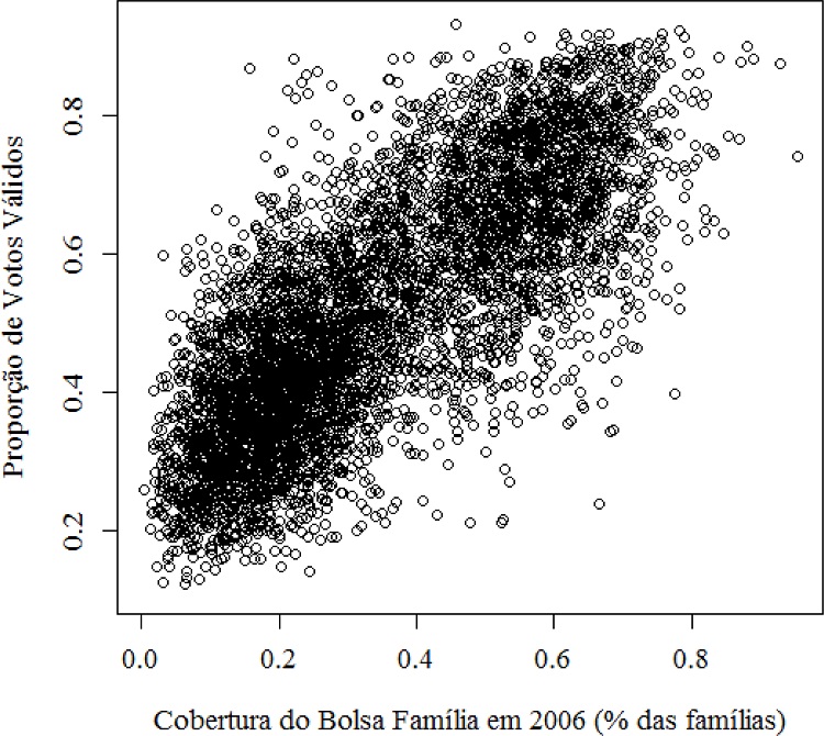 A história por trás do padrão ilustrado pelo Gráfico 1 parecia óbvia. Quanto mais o governo investiu no Bolsa Família, maior foi o apoio eleitoral de Lula no município. Logo, o programa alcançou o status de principal variável explicativa para o desempenho eleitoral do candidato petista em artigos publicados em periódicos nacionais e internacionais ( Hunter e Power, 2007; Licio, Rennó e Castro, 2009; Soares e Terron, 2008; Zucco, 2008, 2013) e não demorou muito para a grande mídia brasileira começar a reproduzir essas interpretações. Afirmações de que “o programa explicaria X% da votação em Lula” ou de que “para cada Z investido no programa, Lula teria obtido Y votos” se tornaram frequentes em jornais de grande circulação, na maioria das vezes autorizadas por analistas políticos brasileiros. 1 O consenso que se formou após as eleições de 2006 está ainda em voga: os pobres recompensaram Lula nas urnas e o Bolsa Família o ajudou a se reeleger. Isso explicaria porque seu desempenho eleitoral nos municípios está tão fortemente associado com a cobertura do programa em 2006.