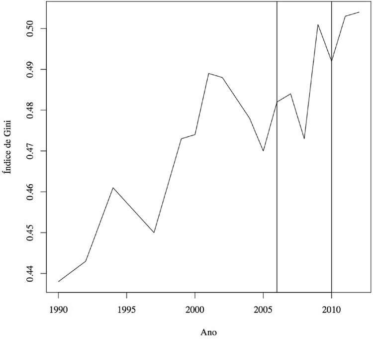 A Tabela 5 também mostra que quatro eleições fugiram ao padrão, mas por razões diferentes. Os resultados para a eleição brasileira de 2010 indicam manutenção do mapa eleitoral observado na eleição anterior, com ganhos e perdas de votos pouco associados à cobertura do Bolsa Família. O intercepto para aquela eleição, apesar de positivo, é o menor de todos em valores absolutos, e o coeficiente, apesar de negativo, é também o menor de todos e muito próximo a zero. Tão forte foi o rearranjo regional das bases eleitorais do candidato petista em 2006 que pouco espaço restou para um novo rearranjo em 2010. O modelo para a eleição costa-riquenha de 2009 é o único que realmente foge completamente ao padrão. Naquele país, a candidata incumbente Laura Chinchilla do PLN ganha votos nas áreas de menor cobertura e perde nas áreas mais pobres. Uma possível explicação pode ser encontrada no desenho pouco convencional do programa de TRC daquele país, o Avancemos. Trata-se do único programa latino-americano que cobria apenas adolescentes cursando o ensino secundário, isto é, aqueles que já haviam cursado seis anos do ensino primário, o que exclui automaticamente milhares de famílias vivendo em extrema pobreza. Além do mais, diferentemente dos demais países, o nível de desigualdade social da Costa Rica cresceu consideravelmente durante o mandato de Óscar Arias (2006-2010), como mostra o Gráfico 3. O conjunto das ações do governo provavelmente mais do que compensou o possível efeito equalizador do Avancemos e aumentou a distância entre pobres e ricos no país. A eleição equatoriana de 2006 foge à regra porque o coeficiente da cobertura do BDH, apesar de positivo, é estatisticamente insignificante, e a eleição de 2009 no mesmo país é também um caso desviante, porque Rafael Correa ganhou votos no país inteiro, apesar de ter ganhado mais nas áreas de maior cobertura.