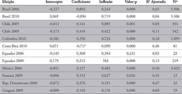 A Tabela 5 apresenta os resultados e mostra que dois terços dos modelos estimados seguiram o padrão esperado de intercepto negativo e coeficiente positivo. Em todas essas oito eleições, o incumbente perdeu votos nas áreas de baixa cobertura e ganhou votos nas áreas com maior proporção de beneficiários. A eleição em que este padrão foi mais forte foi a brasileira de 2006. Note que é esse o modelo em que o incumbente perde mais votos em áreas com cobertura próximas a zero (menor intercepto), em que a associação entre cobertura e ganho de votos é a mais forte (maior coeficiente) e em que a cobertura do programa tem um dos maiores poderes explicativos para a variação do ganho de votos (segundo maior R2 ajustado). De acordo com o modelo, naquela eleição Lula só ganha votos em municípios cuja cobertura do Bolsa Família é maior que 24,3% do total de famílias, ou seja, em cerca de 60% dos municípios brasileiros, onde vive apenas 35% da população. A perda de votos em áreas de baixa cobertura também foi muito grande na eleição chilena de 2009 e na colombiana de 2010. Nestas eleições, o incumbente só ganha votos nas unidades onde a cobertura foi maior do que 42% no Chile e 72% na Colômbia. O Chile Solidario não alcançou esse nível de cobertura em nenhuma comuna e os resultados do modelo refletem o fato de que a coalizão governista perdeu votos em quase todo o território entre 2005 e 2009. A Colômbia tem um programa maior e alguns municípios tiveram cobertura acima do ponto de inflexão. Apesar da grande perda de votos, o incumbente Juan Manuel Santos venceu a eleição.