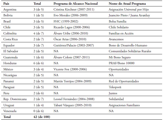As características de cada programa variam muito entre os países e com o passar do tempo. Para os propósitos deste artigo, a variação mais importante diz respeito ao fato de alguns terem alcance nacional e outros serem regionalizados (isto é, não cobrirem todas as unidades territoriais do país). Eu classifiquei um programa de TRC como de alcance nacional quando pelo menos 95% das unidades administrativas de segunda ordem estão cobertas (essas unidades são os municípios no caso brasileiro). Em junho de 2014, doze países possuíam pelo menos um programa que atendia a esse critério e a terceira coluna da Tabela 1 identifica a administração presidencial que o universalizou.