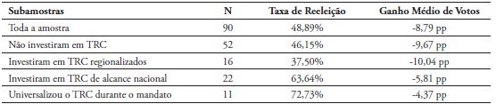 A Tabela 2 ilustra alguns fatos interessantes. Em primeiro lugar, ela confirma achados anteriores de que incumbentes tendem a perder votos entre uma eleição e outra ( Paldam, 1991; Nannestad e Paldam, 2002). Na América Latina, eles perderam em média quase nove pontos percentuais de votos válidos no período analisado. Apenas 22 deles (quase 25% do total) ganharam votos. Em segundo lugar, a categoria de incumbentes que mais perdeu votos foi a daqueles que investiram em programas de TRC regionalizados. Como sugerido na seção anterior, uma possível explicação é que a negação de benefícios por razões não relacionadas ao nível de pobreza da família pode ter sido politicamente explorada como um sinal de injustiça. Isto poderia ter levado ao declínio da popularidade do presidente entre os pobres que não foram beneficiados. Em terceiro lugar, aqueles que investiram em programas de alcance nacional tiveram um desempenho consideravelmente melhor e a taxa de reeleição desta categoria é bastante alta. Ainda assim, esses incumbentes também não fugiram à assertiva de Paldam (1991) de que “governar custa votos”.