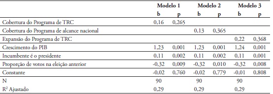 A Tabela 3 apresenta os resultados de três modelos de regressão linear que estimam a influência de investimentos em programas de TRC no desempenho eleitoral de incumbentes. Cada um dos três modelos estimados utiliza uma variável explicativa diferente. No primeiro, utilizei a cobertura do programa, isto é, o número de famílias beneficiárias dividido pelo número total de famílias na data mais próxima possível do dia da eleição. No segundo modelo, utilizei a mesma variável apenas para casos em que o programa já tinha alcance nacional no dia da eleição e codifiquei todos os demais casos como zero (incluindo programas de TRC regionalizados). No terceiro modelo, utilizei um indicador de expansão do programa, ou seja, a cobertura no dia da eleição menos a cobertura no dia da eleição anterior. Informações sobre o número de famílias beneficiárias foram coletadas diretamente de agências ou ministérios responsáveis pela administração do programa em cada país e informações sobre o número total de famílias foram coletadas do censo realizado no ano mais próximo ao da eleição, desde que os dados já tivessem sido divulgados em novembro de 2014.