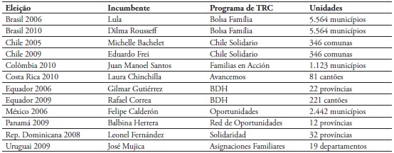 O que esses dados revelam é que a distribuição geográfica do apoio eleitoral do incumbente foi afetada de forma semelhante por programas de TRC, independentemente da composição original de suas bases eleitorais. Alguns presidentes tinham sido eleitos com um melhor desempenho em áreas pobres (por exemplo, Lúcio Gutiérrez no Equador em 2002 e Martín Torrijos no Panamá em 2004); outros tinham obtido maior apoio em grandes cidades e áreas urbanas (por exemplo, Leonel Fernández na República Dominicana em 2004 e Tabaré Vázquez no Uruguai em 2004); e ainda outros haviam tido desempenho mais equilibrado em todas as regiões (por exemplo, Lula no Brasil em 2002, Ricardo Lagos no Chile em 1999 e Álvaro Uribe na Colômbia em 2006). Uma das únicas características que esses presidentes têm em comum é o fato de terem investido num grande programa de TRC que beneficiou predominantemente famílias pobres vivendo nas áreas mais subdesenvolvidas do território nacional. Como consequência, a distribuição geográfica de seu apoio eleitoral (ou dos candidatos que apoiaram na eleição seguinte) foi afetada de forma semelhante: ganharam votos nas áreas pobres e perderam votos nas áreas ricas.