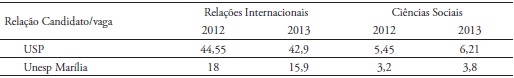 Finalizando esta seção sobre o ensino de graduação, utilizamos um recorte casual, com o objetivo de ilustrar a discussão aqui empreendida. Fizemos uma comparação quantitativa ( Tabela 1) do interesse dos jovens nas ciências sociais, de um lado, e nas relações internacionais, de outro, utilizando a proporção candidato/vaga na USP e na Unesp, campus de Marília, em 2012 e 2013. Trata-se de uma comparação indicativa, pois nem todos os parâmetros foram levados em conta, nem mesmo a evolução do número absoluto de vagas. A comparação com outros cursos seria também importante, ainda que as ciências sociais seja o curso de maior afinidade. Considerando os dois mais recentes vestibulares da USP, 1 verificamos que a proporção candidato/vaga entre ciências sociais e relações internacionais é de um para sete a oito candidatos; na Unesp, campus de Marília, 2 essa proporção alcança um para quatro a seis candidatos. O que se pode observar com base nesses dados é a maior competitividade na seleção dos cursos de relações internacionais. Contudo, a evolução da procura só poderia ser aferida pelo acompanhamento de séries históricas mais extensas dos inscritos nos vestibulares, buscando medir qual é a escala de crescimento ou de diminuição do interesse por cada curso.