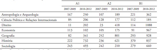 Os dados das avaliações realizadas pela Capes dão uma ideia quantitativa da progressão na publicação de artigos. Até a avaliação trienal de 2004-2006, a classificação dos periódicos distribuía-se em A, B e C; a diferenciação se dava entre periódicos de impacto internacional, nacional e local. A partir do triênio 2007-2009, foi utilizada a classificação A1, A2, B1, B2, B3, B4, B5 e C. Consequentemente, para o objetivo comparativo a que nos propomos, optamos por utilizar apenas os últimos dois triênios.