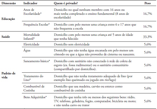 A definição de dimensões, indicadores, critérios de privação e pesos das variáveis do IPM para o Brasil são semelhantes aos da metodologia proposta por Alkire e Foster (2011a e 2011b). Todavia, no presente estudo, foram realizados alguns ajustes visando à adequação do índice às especificidades do padrão de privação da população brasileira e das variáveis disponíveis no banco de dados, (uso de proxies) ( Tabela 1)