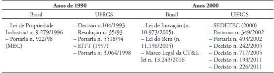 Na década de 1990, as três primeiras normas estabelecidas pela universidade, relativas aos processos de prestação de serviços científicos, foram atualizadas com base na decisão n. 242/2005. Somado a isso, a partir das mudanças políticas no cenário nacional, principalmente com a regulamentação da Lei de Inovação (n. 10.973), a universidade passou a normatizar as ações de parceira(s) acadêmica(s) por meio da decisão n. 717/2005 e da decisão n. 193/2011 ( UFRGS, 2014).