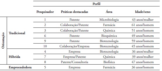 Todos os pesquisadores aqui entrevistados que tinham a patente como a única prática de interface universidade-empresa orientam-se de modo tradicional. Um caso em que o pesquisador participou tanto da criação de patentes como de atividades de consultorias apresentou orientação híbrida. Três pesquisadores que atuaram principalmente em colaborações com empresas e, paralelamente, na criação de patentes e de empresa, seguiram a orientação tradicional. Por fim, cabe salientar que dois pesquisadores que participaram da criação de empresa orientaram-se de modo híbrido e apenas um pesquisador, o mais jovem entre os entrevistados, apresentou orientação empreendedora.