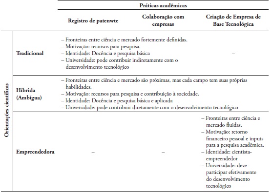 A orientação tradicional híbrida, por sua vez, assemelha-se ao tipo tradicional, mas com uma maior acomodação e resignação à necessidade das colaborações com as empresas. Isto é, os vínculos não são desejados, mas considerados inevitáveis. O terceiro tipo define a orientação empreendedora híbrida, que caracteriza aqueles pesquisadores que julgam serem profícuas as relações universidade-empresa, porém reconhecem a necessidade de manter as fronteiras. Diferente dos dois tipos tradicionais, aqui aplica-se o conhecimento em tecnologias e estabelecem-se redes e trocas de conhecimento.