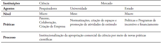 A teoria institucional oferece conceitos que auxiliam na análise tanto das implicações da mudança no âmbito da produção científica e tecnológica, como, por exemplo, o crescimento de determinados tipos de práticas sociais, quanto no que se refere aos processos sociais, que ora podem reforçar a reprodução das ordens sociais vigentes ora podem flexionar essas ordens, reformulando valores e práticas que orientam os cientistas. O conceito de institucionalização refere-se a um processo que legitima um conjunto de práticas, que no caso do presente estudo estão relacionadas com as práticas de profissionais da ciência que aceitam em algum grau a apropriação comercial da ciência. Contudo, Colyvas e Jonsson (2011) sublinham que uma prática pode ser legítima sem ser institucionalizada. Um processo é a difusão de novas práticas e a aceitação genérica de que aquilo é permitido. Outro processo é a mera aceitação transformar-se na integração de uma nova prática em um sistema de significado social. Ou seja, a institucionalização refere-se mais à penetração, duração e consistência de novas práticas em um campo do que apenas a sua difusão.