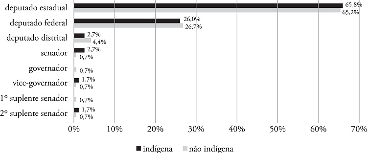 Assim como ocorreu nos outros grupos formados pela autodeclaração racial, a maior parte das candidaturas indígenas – 65,8% – concorreu em 2014 ao cargo de deputado estadual. Isso era o esperado, pois é onde há mais vagas em disputa. Para deputado federal foram registradas dezenove candidaturas (26%); para os cargos de deputado distrital e senador, duas (2,7%); e para vice-governador e segundo suplente foi registrada apenas uma candidatura para cada posição (1,4%). Eleições majoritárias (governador, senador) são dispendiosas e demandam muito capital político, coligações partidárias extensas e candidaturas muito estruturadas, além de dependerem da possibilidade de acesso a financiamentos robustos. Por sua vez, em eleições para deputado federal há poucas cadeiras em disputa (apenas 513) e é preciso conseguir uma boa votação no distrito eleitoral, que corresponde ao estado todo. As vagas para deputado estadual são, assim, um pouco menos difíceis de se conquistar. Além disso, há uma dimensão regional importante na construção das lideranças indígenas como figuras públicas, o que, também, direciona suas ambições para o âmbito estadual.