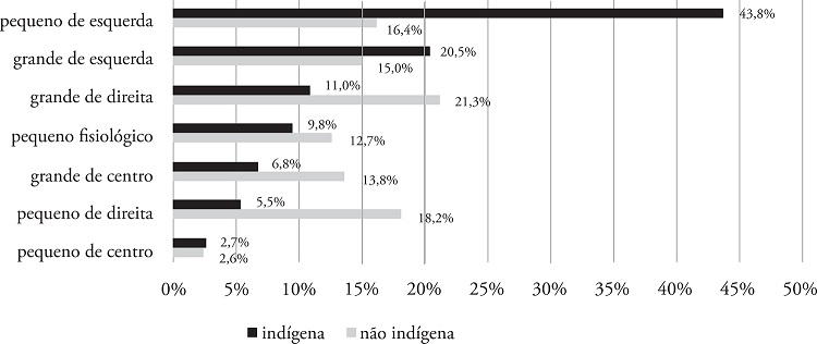 Quando os partidos políticos são separados em sete categorias, combinando agora ideologia e tamanho, há novamente um padrão bem reconhecível das candidaturas indígenas. Isso talvez se deva, por parte dos partidos, a uma combinação complexa entre a disposição efetiva das legendas para promover ou não determinada minoria,18 ao cálculo de viabilidade eleitoral dos concorrentes, à necessidade de se lançar uma lista grande para aumentar os votos na legenda, entre outros fatores que precisariam ser mais bem investigados. Do lado do concorrente, as filiações podem estar orientadas pela mera oportunidade de se encontrar uma legenda que o aceite, por inclinações pessoais ou por concessões políticas ao grupo de origem.
