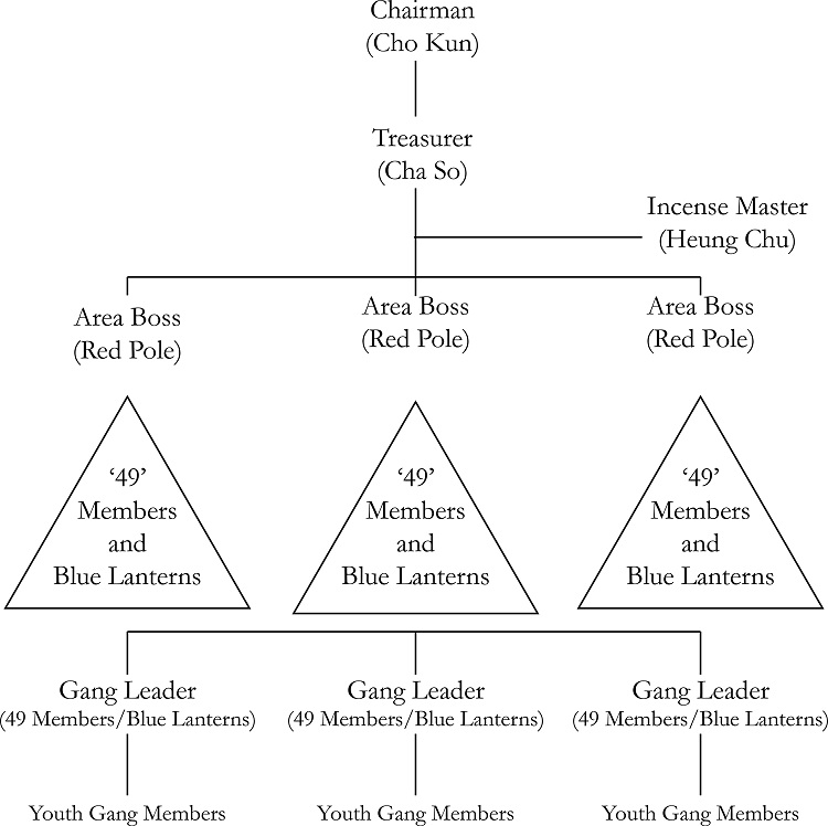 O que se demonstra é que, longe de as tríades comporem a velha e tradicional estrutura piramidal, sua organização atualmente é baseada em redes de contatos que prestam variados serviços, sendo que nem todos os membros das tríades chinesas são necessariamente relacionados com o crime organizado ou com atividades ilícitas, assim como nem todos os grupos criminosos compostos por chineses são integrantes das tríades.7
