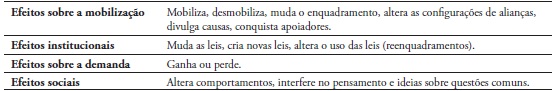A contribuição que aqui apresentamos visa, também, trazer aspectos ainda não (ou pouco) considerados no debate internacional sobre as consequências do uso de estratégias judiciais. Partimos de dados empíricos e retornamos à teoria para oferecer elementos que contribuam para uma caracterização de tipos diversos de efeitos, quais sejam: efeitos que alteram ou incrementam os próprios processos de mobilização social e efeitos sobre as instituições.
