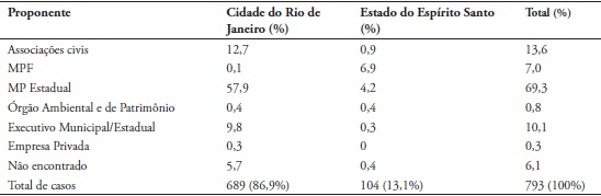 Assim, uma pesquisa levantou e analisou 793 ACPs impetradas no Estado do Espírito Santo e na cidade do Rio de Janeiro na área ambiental.5 Os dados foram produzidos a partir da coleta e da leitura dos registros das ações judiciais e através da realização de entrevistas semiestruturadas com lideranças que fazem uso de estratégias judiciais.