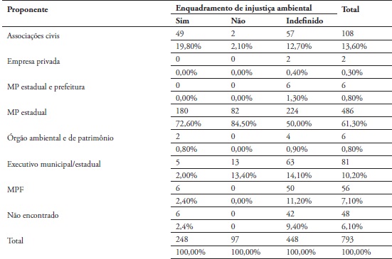 Conforme apresentamos na Tabela 2, na análise das nossas 793 ACPs, verificamos que, em 31,27% dos casos, há relação direta entre as demandas ambientais em questão nos litígios e as populações empobrecidas e marginalizadas.15 Essa caracterização dos litígios enquanto demandas por justiça ambiental fica explícita pela leitura da descrição dos casos, pela característica dos autores e ainda pelas regiões da cidade, em geral regiões industriais, pobres e de risco, onde ocorrem os litígios. Além disso, percebe-se que os proponentes das ACPs relacionadas à justiça ambiental são exatamente aqueles apontados como atores relevantes no nosso esquema de explicação anterior. Isto é, dos casos em que está presente o enquadramento de injustiça ambiental, 19,8% foram propostos pela sociedade civil, e em 75% dos casos onde há esse enquadramento, o proponente da ACP é o Ministério Público estadual ou federal.16