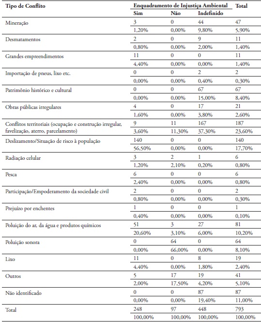 Não obstante, os dados referentes ao tipo de conflito que apresentamos, se comparados com outros dois levantamentos de ações judiciais ambientais, um realizado na década de 1990 na cidade do Rio de Janeiro por Fuks (2001) e outro realizado por Maciel (2002) em São Paulo, entre 1990 e 2001, sugerem que o processo de identificação entre conflitos ambientais judicializados e populações marginalizadas é novo. Nos dois estudos, os principais tipos de conflitos giram em torno de danos aos bens naturais ou culturais ou questões relacionadas aos conflitos de convivência. Nos litígios analisados por Fuks (2001, p. 89), a maior parte estava relacionada à poluição sonora na capital, 24,81%. O tipo de conflito somado ao fator espacial dos litígios levou o autor a observar que