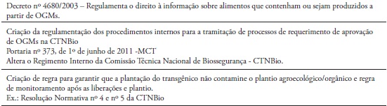Apesar dos ganhos com a rotulagem, diversas outras iniciativas foram propostas pelos defensores da transgenia, e, em 2005, com a aprovação da Lei de Biossegurança (Lei n. 11.105/2005), a CTNBio (Comissão Técnica Nacional de Biossegurança) passou a ter a competência exclusiva para deliberar sobre matéria de aprovação dos OGMs. Essa autonomia é um dos pontos mais criticados pelos setores contra os transgênicos. Um papel fundamental da AS-PTA e da Terra de Direitos23 nesse processo é que ambas acompanham rotineiramente a atividade da CTNBio. Isso graças a um Mandado de Segurança que assegura que as sessões da Comissões sejam abertas ao público.24
