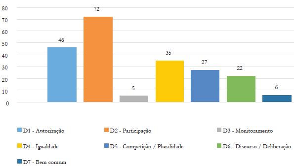 O Gráfico 1 indica a força das dimensões de participação, autorização e igualdade na fala dos entrevistados. Todos estão presentes em mais de um quarto dos excertos, sendo que a dimensão da participação aparece em mais de 51% deles. Pode-se considerar que a de monitoramento e a de bem comum são irrisórias em nosso corpus empírico.