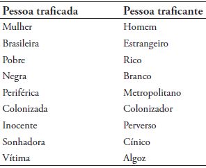 Nessa iconografia, estrangeiros brancos lascivos vêm ao Brasil para recrutar brasileiras pobres e negras para a prostituição forçada no exterior. Vítima e algoz são claramente definidos e representam pontos absolutamente opostos em termos estruturais, conforme apresentamos no Quadro 1.