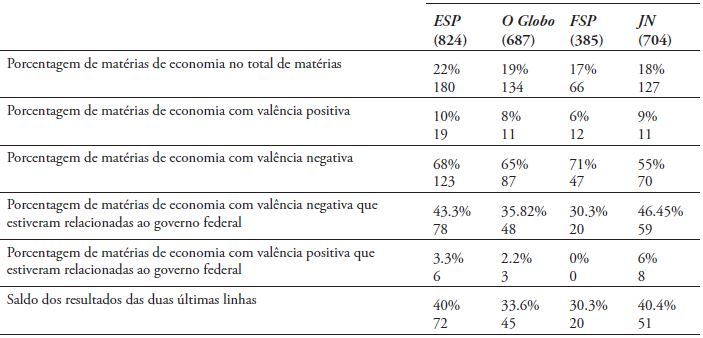 Em síntese, a Folha de S. Paulo é o jornal que menos pauta a economia, embora seja o que apresenta uma leitura mais negativa do assunto, bem como o meio que menos relaciona matérias econômicas de valência negativa ao Governo Federal. Por sua vez, o Jornal Nacional é aquele que, embora também paute menos o assunto, apresenta a leitura menos negativa da economia e o jornal que mais relaciona matérias negativas ao governo federal.