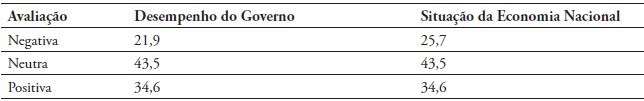 Estimamos os modelos de regressão logística multinominal, nos quais as variáveis dependentes foram a avaliação do governo federal e a avaliação retrospectiva sociotrópica da economia. Para ambas as variáveis foram adotados três valores: “negativa”, “neutra” e “positiva”. A categoria “negativa” nos dois casos foi utilizada como referência. Os dados descritivos referentes às variáveis dependentes estão na Tabela 2.