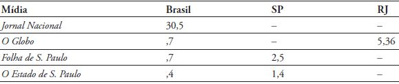 Os resultados mostram que o jornal que mais enfatiza o tema economia, em termos absolutos e proporcionais, é o O Estado de S. Paulo (22%), seguido de O Globo (19%); na sequência, o Jornal Nacional (18%) e a Folha de S. Paulo (17%). Registra-se, contudo, que as taxas de presença das matérias são muito próximas nos veículos. Ou seja, a economia contou com aproximadamente 20% do espaço da cobertura total dos jornais.