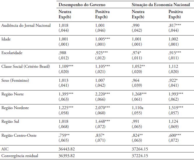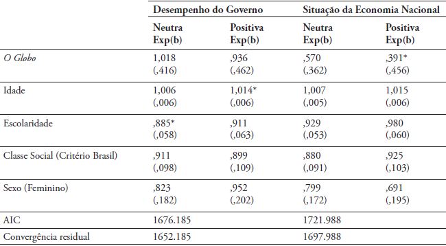 No segundo modelo, a variável relativa à leitura de O Globo se mostrou estatisticamente significativa apenas para a categoria positiva, com efeito redutor de 61%, ou seja, o grupo de pessoas que lê o jornal tem 61% menos chance de avaliar positivamente a situação da economia nacional. Assim como no modelo anterior, é importante destacar que esse efeito já é controlado por todas as variáveis sociodemográficas inseridas na equação, as quais não alcançaram o nível exigido de significância.