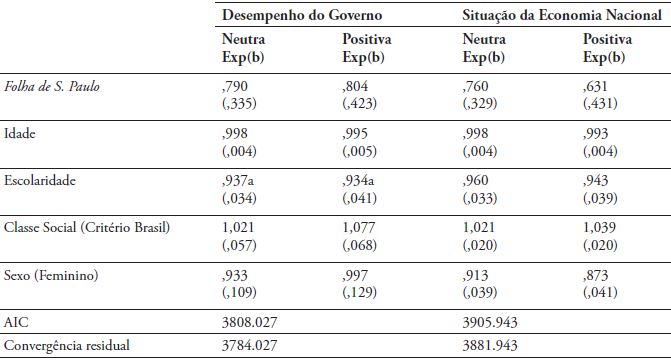 A Tabela 5 apresenta as estimativas geradas pelos modelos que tomam como principal variável independente a condição de leitor do jornal A Folha de S. Paulo entre os paulistas. Tanto sobre a avaliação do governo quanto sobre a avaliação da economia, constatamos que ser leitor do jornal impresso, ao menos nos finais de semana, não é uma condição estatisticamente relevante para a adesão a avaliações positivas ou negativas acerca do governo ou da economia. Da mesma forma, não se verificou efeito das variáveis de controle na avaliação do desempenho do governo federal e nem mesmo na avaliação da economia entre as categorias neutra e positiva. A exceção ficou apenas por conta da escolaridade, que reduz a chance de avaliações neutras e positivas do governo.