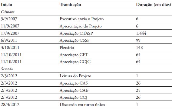 Já na legislatura de 2011-2015, a matéria foi apreciada por três comissões, Comissão de Seguridade Social e Família (CSSF), Comissão de Finanças e Tributação (CFT) e Comissão de Constituição e Justiça e de Cidadania (CCJC) em pouco mais de três meses. Destaca-se, neste ponto, a solicitação de urgência apresentada pelo Executivo.7 Ainda assim, no plenário da Câmara foram necessários mais cinco meses para a aprovação do PL n. 1992/2007. No Senado, o trâmite do projeto foi mais célere, menos de um mês, incluindo apreciação das comissões, discussão e votação. Como notado anteriormente, coube à casa revisora apenas ratificar o que havia sido aprovado na Câmara dos Deputados, sem promover alterações que pudessem levar o projeto novamente para apreciação da primeira casa.