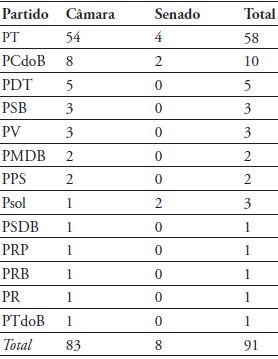 Em termos de composição partidária, na 54a Legislatura, os deputados sindicalistas integravam treze partidos. Na Câmara dos Deputados, a maioria absoluta estava na base de apoio do governo: 54 parlamentares no PT, oito no PCdoB, cinco no PDT, três no PV, três no PSB, dois no PMDB, dois no PPS, um no PR, um no PRB, um no PRP, um no PSDB, um no PTdoB e um no Psol. No Senado, eram oito parlamentares: quatro no PT, dois no Psol e dois no PCdoB. Com exceção do PSDB, do Psol e do PPS, todos os demais partidos integravam a base ampliada do governo no Congresso Nacional. Tal composição era um forte indicador de que a maioria dos deputados sindicalistas deveria seguir a orientação do Executivo na votação da criação da Funpresp.