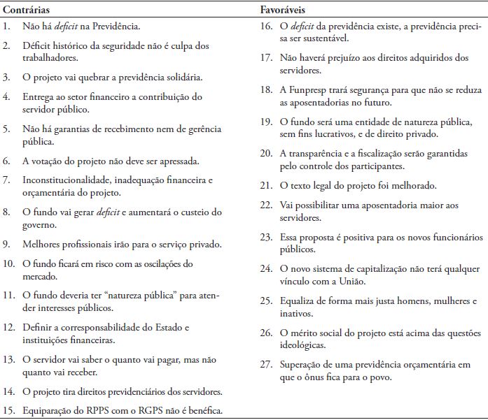 O Quadro 3 representa as principais categorias de discurso sindical favoráveis e contrárias à criação do regime de previdência complementar dos servidores públicos federais: